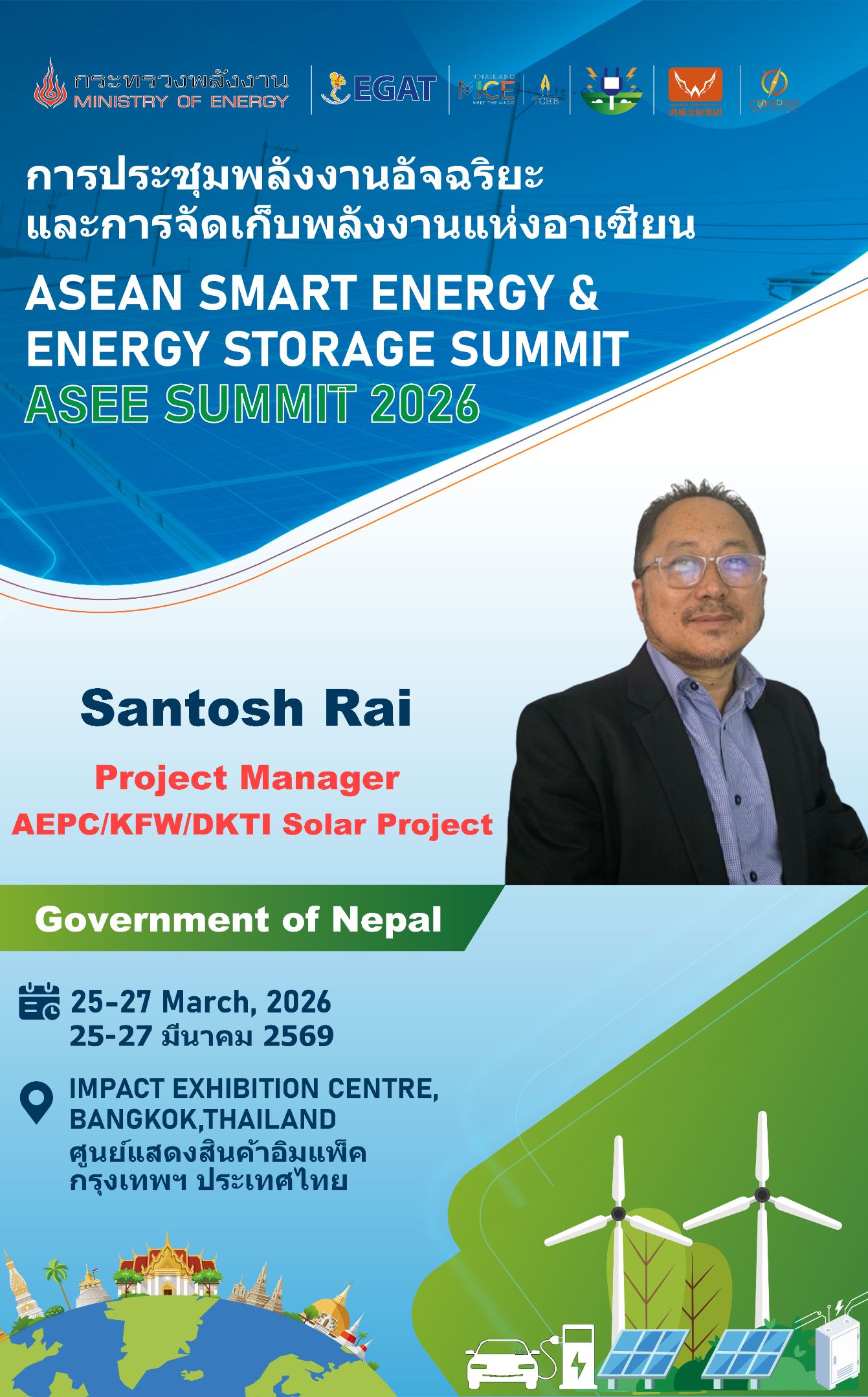 เรารู้สึกเป็นเกียรติอย่างยิ่งในการต้อนรับ คุณ Santosh Rai ผู้จัดการโครงการจาก AEPC / KFW – Solar Energy Project ในฐานะวิทยากรระดับผู้ทรงคุณวุฒิ ณ ASEE–ASEAN Smart Energy & Energy Storage Expo 2026 Summit ซึ่งจัดควบคู่ไปกับงานแสดง ASEE 2026